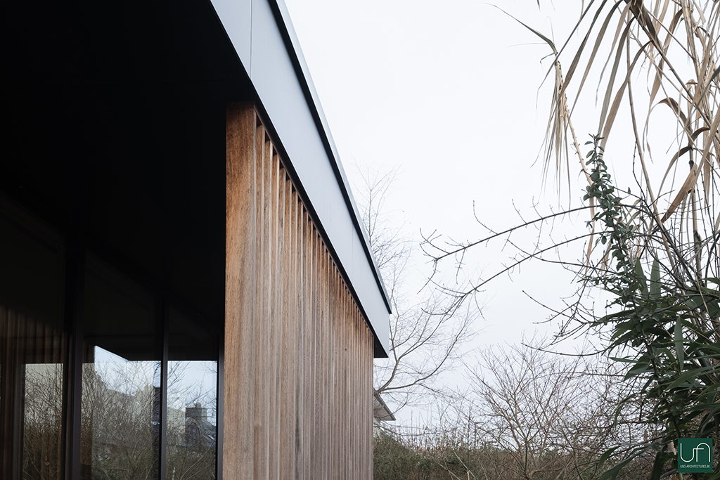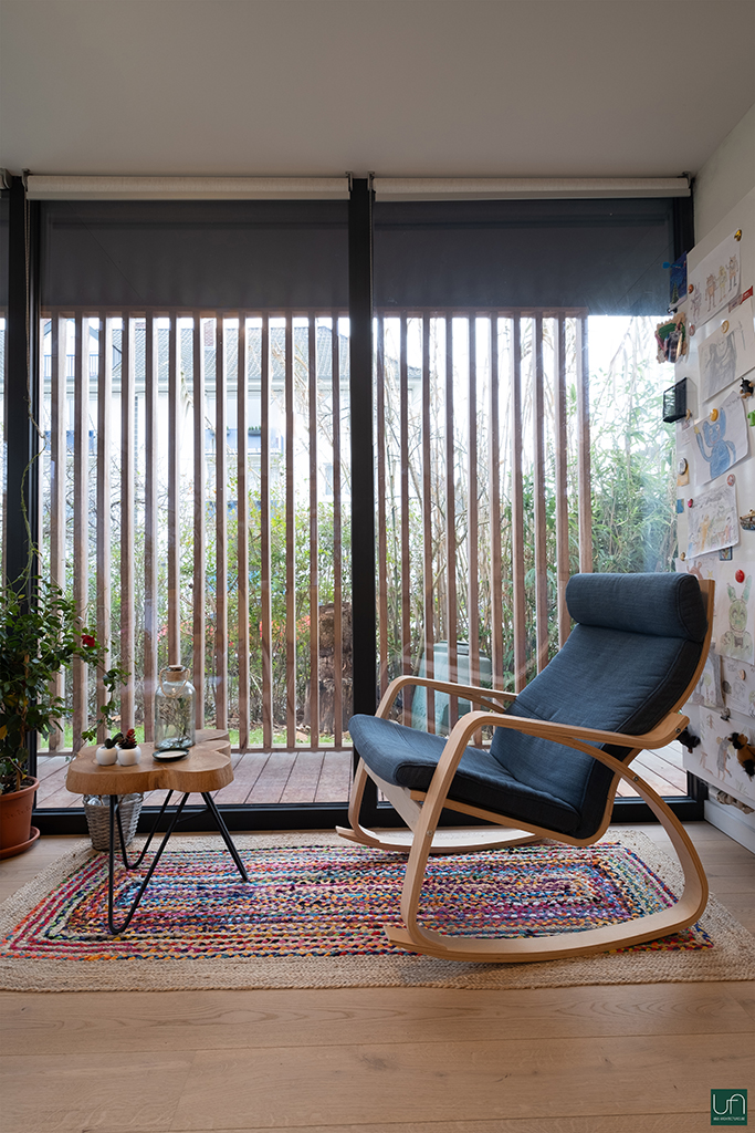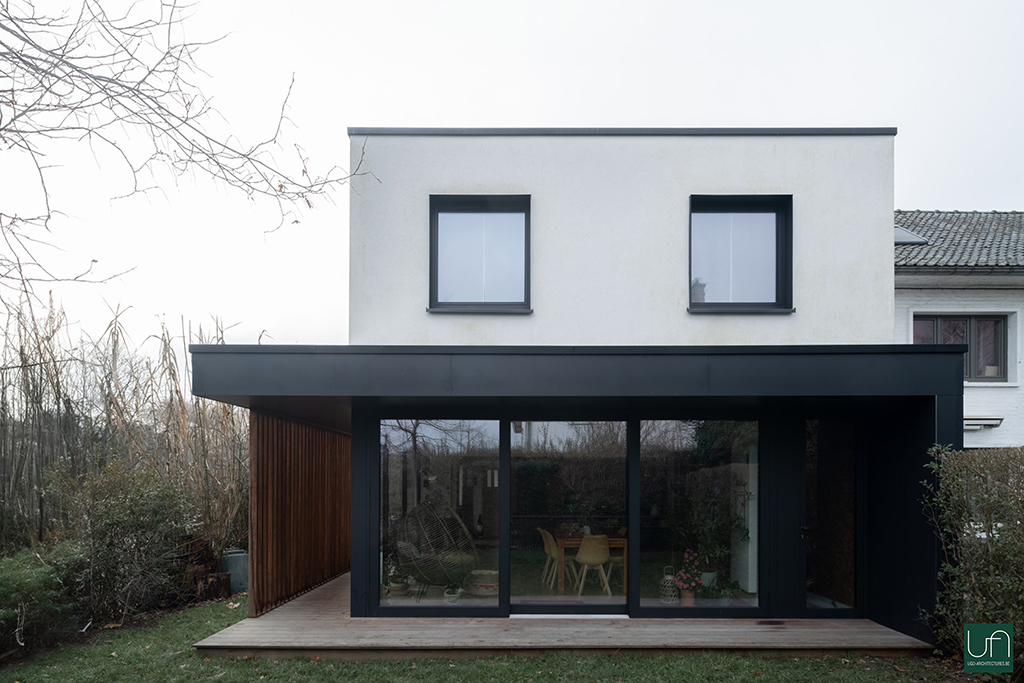 La volumétrie du projet est simple, dynamisée par une casquette (protection solaire) qui amène de la légèreté au projet. Un claustra en bois ajouré permet de soutenir la casquette et de préserver l’intimité par rapport à la voirie. La casquette se prolonge jusqu’à l’entrée, ce qui intègre l’extension à l’existant.